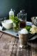 - Mint sprigs placed in a glass of water to keep them fresh.